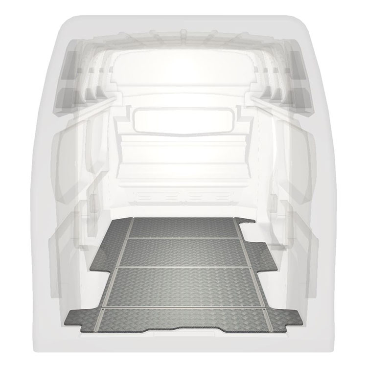 Lett og robust varebilgulv med tverrgående skinner til Renault Trafic / Opel Vivaro / Fiat Talento / Nissan NV300 med sklisikker tråplate i aluminium og lastskinner (langsgående og tverrgående) for rask og sikker installasjon av hyllesystemer og tilbehør.