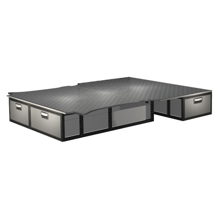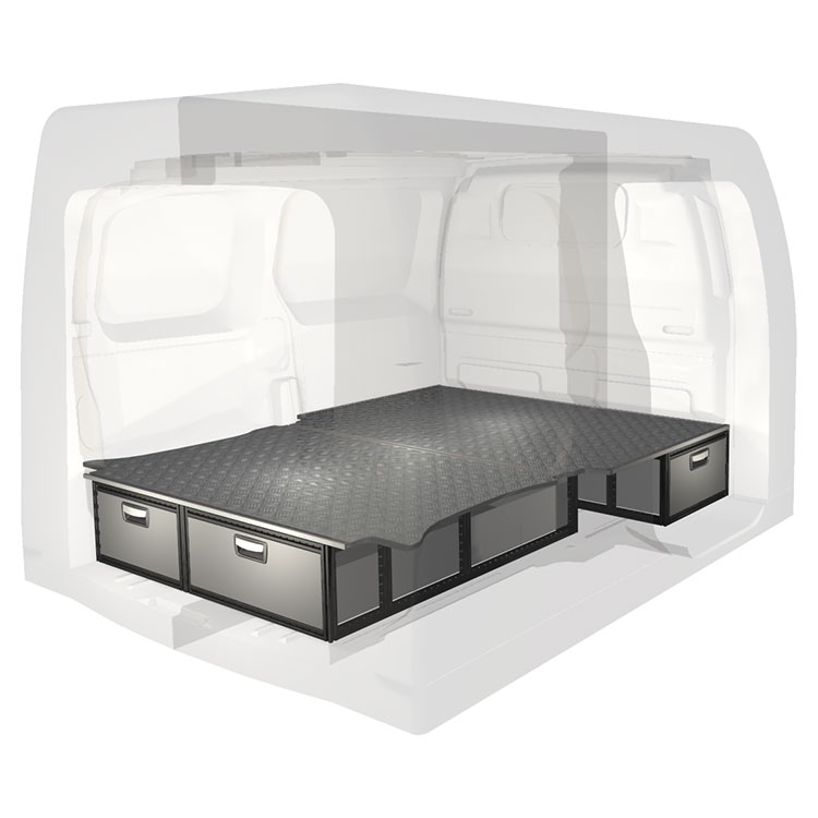 Kitet är designat för installation ovanpå ett trägolv. Dubbelgolvets skenor möjliggör enkelt montage av fordonsinredning och kantlister bidrar till en snygg finish.
