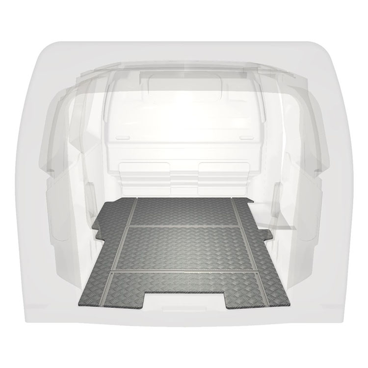 Lett og robust varebilgulv med tverrgående skinner til Citroën Jumpy / Peugeot Expert / Toyota ProAce med sklisikker tråplate i aluminium og lastskinner (langsgående og tverrgående) for rask og sikker installasjon av hyllesystemer og tilbehør.