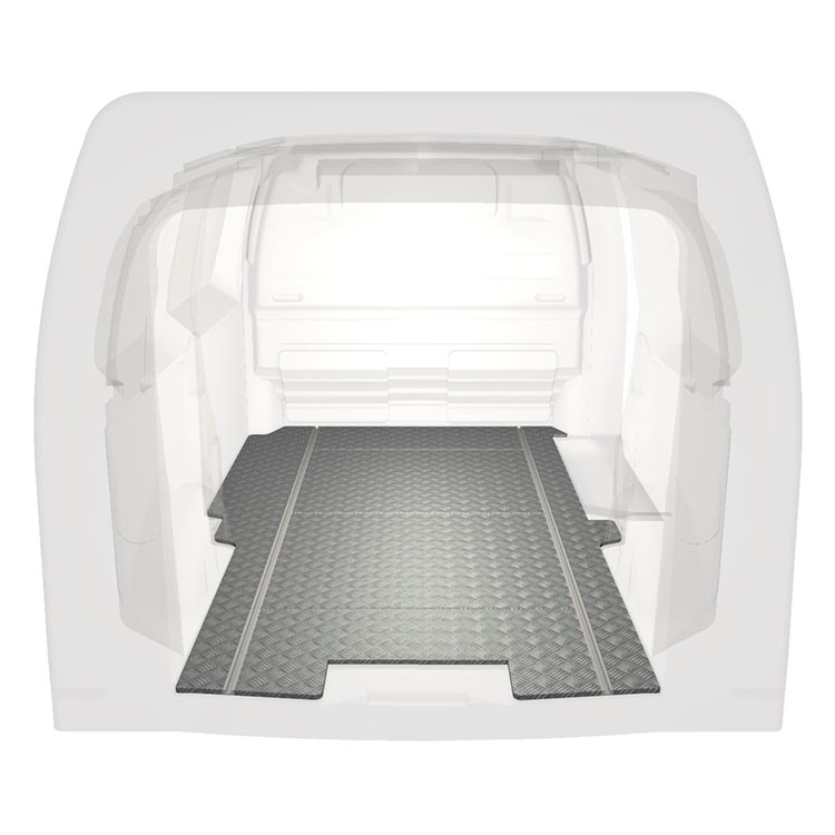 Lett og robust standard varebilgulv til Citroën Jumpy / Peugeot Expert / Toyota ProAce sklisikker tråplate i aluminium og lastskinner (langsgående) for rask og sikker installasjon av hyllesystemer og annet tilbehør.
