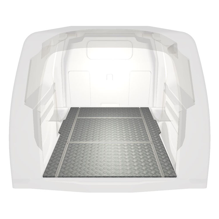 Lett og robust varebilgulv med tverrgående skinner til Berlingo/Partner/Combo 19- med sklisikker tråplate i aluminium og lastskinner (langsgående og tverrgående) for rask og sikker installasjon av hyllesystemer og tilbehør.
