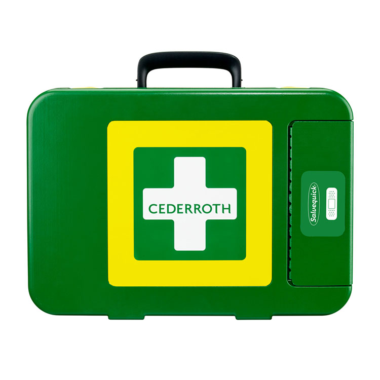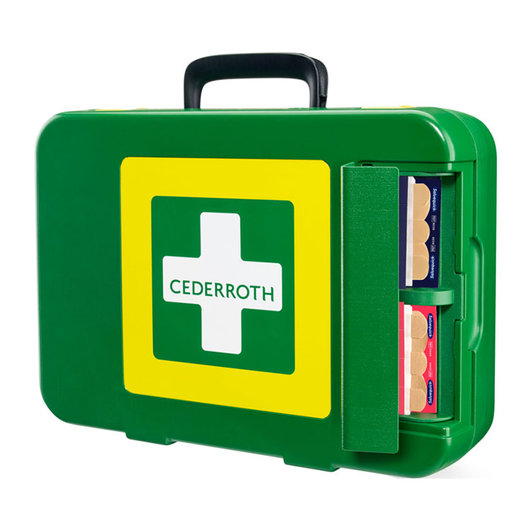En solid og velutstyrt Førstehjelpsveske i hardplast, konstruert for å holde støv, fukt og smuss ute også i røffe miljøer. Plasterautomaten på utsiden gjør det enkelt å ta et plaster samtidig som innholdet i vesken forblir urørt og hygienisk rent.
