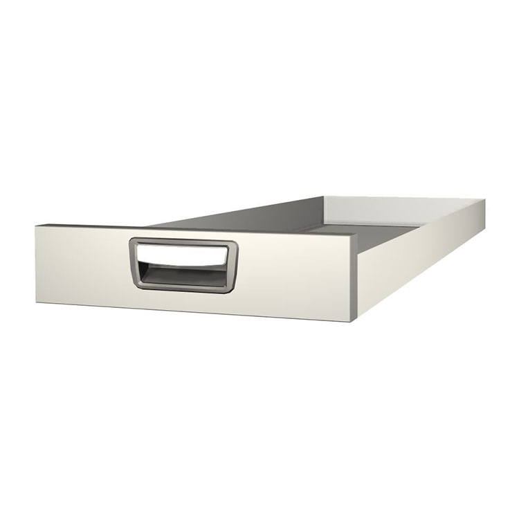 Robust ekstra lang skuff for montering i en skuffeenhetsramme. Skuffen er laget av aluminium og har kulelager som standard. Miksen av faste og rørlige lager gjør skuffen stabil og enkel å betjene.