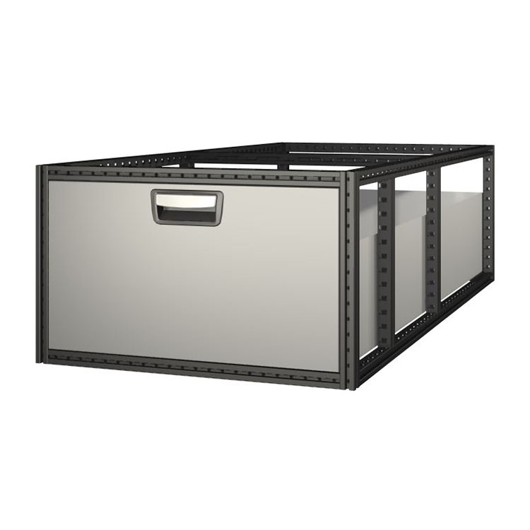 De ekstra lange skuffeenhetene har en ramme i ultrahøylegert stål og skuffer i aluminium. Skuffene er utrustet med kulelager som standard. Miksen av faste og rørlige lager gjør skuffen stabil og enkel å betjene.