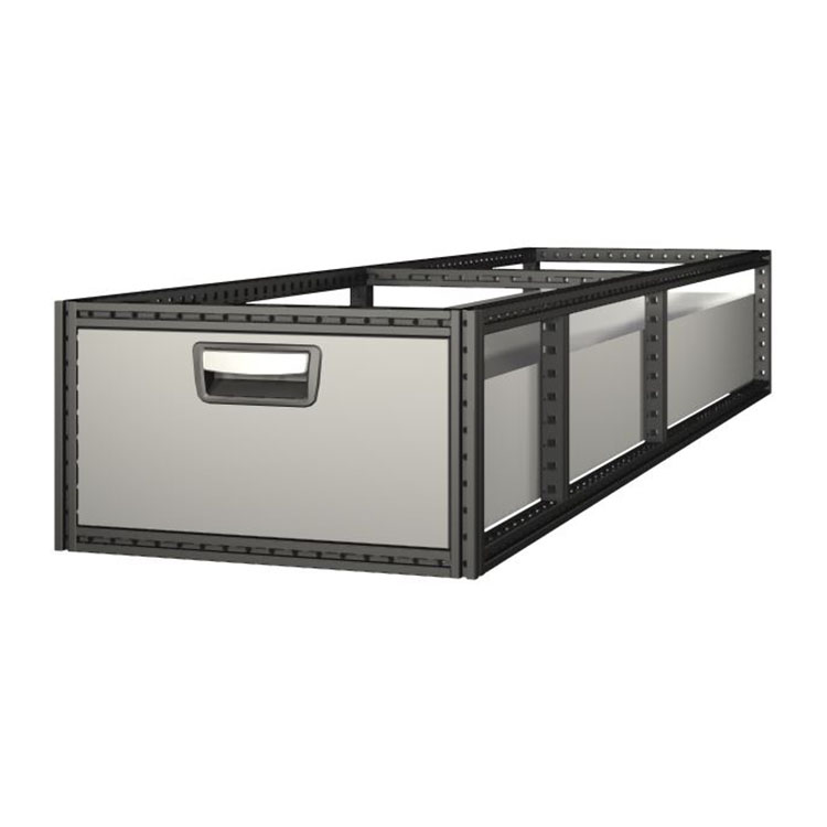 De ekstra lange skuffeenhetene har en ramme i ultrahøylegert stål og skuffer i aluminium. Skuffene er utrustet med kulelager som standard. Miksen av faste og rørlige lager gjør skuffen stabil og enkel å betjene.