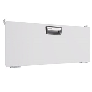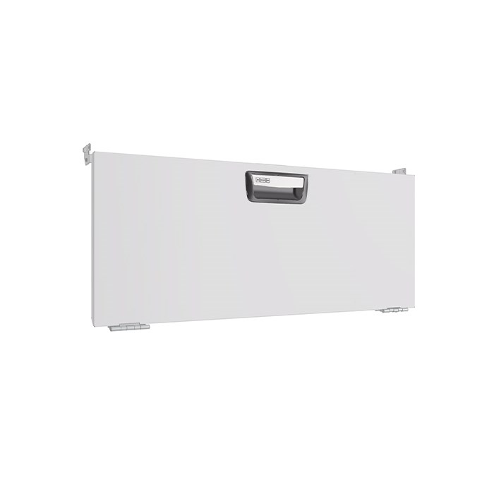 Luckan är utrustad med gasfjädrar på båda sidor för en mjukare öppnings- och stängningsfunktion. Öppningsvinkel 90 grader. Luckans handtag har en inbyggd spärr som hindrar den från att öppnas under färd. Passar även hjulhusstativ som har försetts med arbetsplatta. Vid montering mellan två hyllstegar måste en monteringsram användas.
