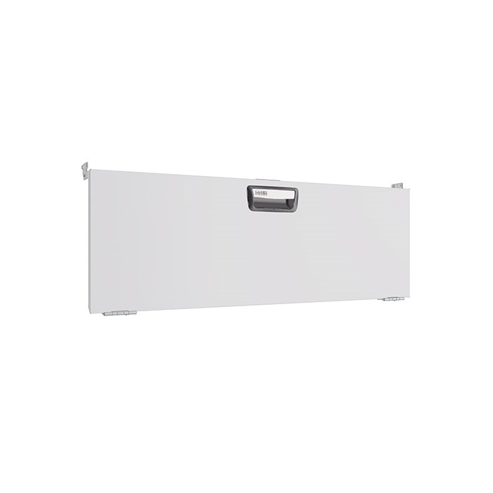 Luckan är utrustad med gasfjädrar på båda sidor för en mjukare öppnings- och stängningsfunktion. Öppningsvinkel 90 grader. Luckans handtag har en inbyggd spärr som hindrar den från att öppnas under färd. Passar även hjulhusstativ som har försetts med arbetsplatta. Vid montering mellan två hyllstegar måste en monteringsram användas.