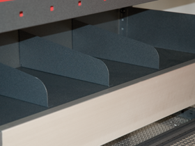 Avdelare för hylla med fällbar front. Hyllavdelaren monteras med popnit och används för att dela in hyllan i mindre fack. Avsedd för hylla med djup 324 mm och höjd 216 mm.