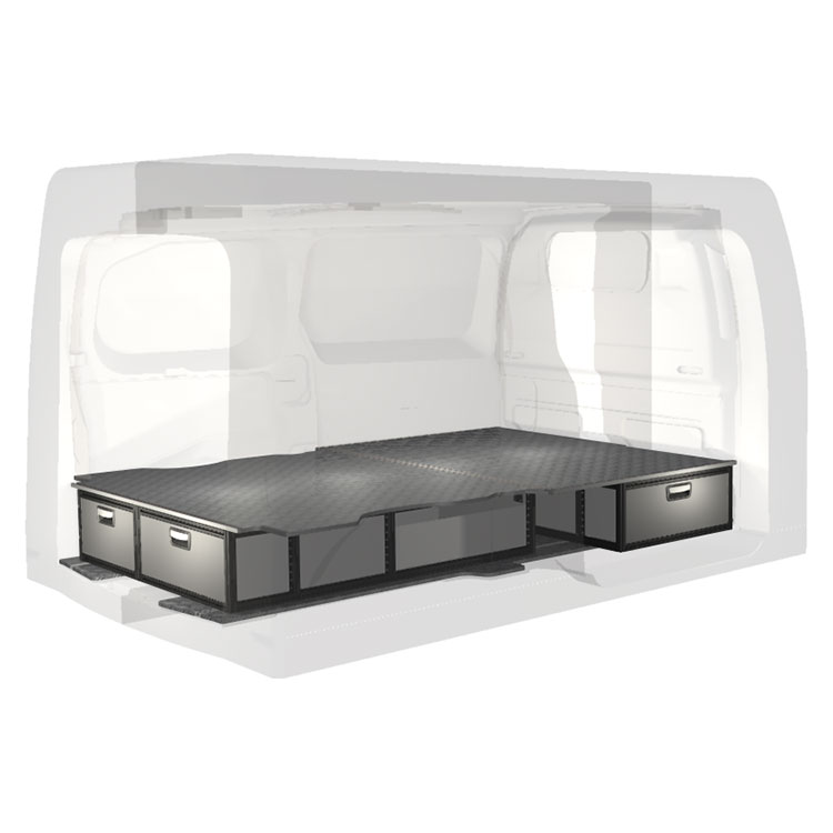 Kitet är designat för installation ovanpå ett Modul-Floor, där det undre golvets skenor nyttjas för en icke-förstörande installation. Dubbelgolvets skenor möjliggör enkelt montage av fordonsinredning och kantlister bidrar till en snygg finish.