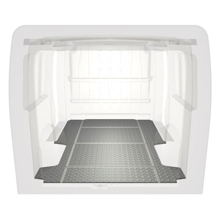 Lett og robust varebilgulv med tverrgående skinner til Citroën Jumper / Peugeot Boxer / Fiat Ducato med sklisikker tråplate i aluminium og lastskinner (langsgående og tverrgående) for rask og sikker installasjon av hyllesystemer og tilbehør.
