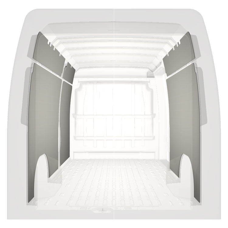 Lett full kledning til innerveggene i Citroën Jumper / Peugeot Boxer / Fiat Ducato med høyre sidedør.Kledningen gir et lyst og trivelig arbeidsmiljø, og er enkel å tørke av.