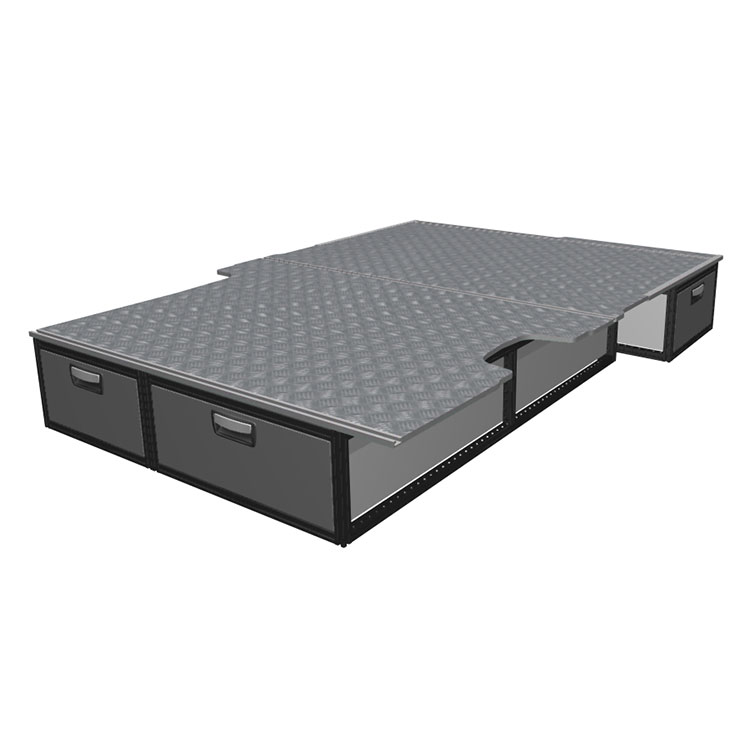 Kitet är designat för installation ovanpå ett trägolv. Dubbelgolvets skenor möjliggör enkelt montage av fordonsinredning och kantlister bidrar till en snygg finish.