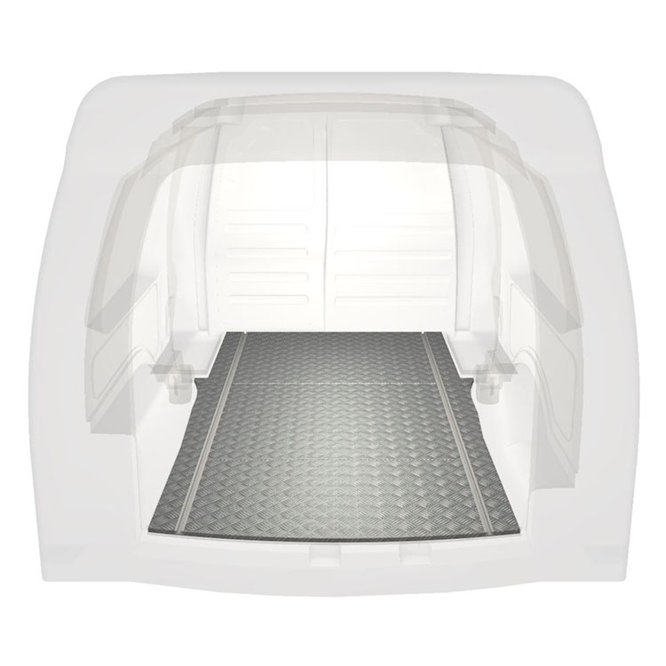 Lett og robust standard varebilgulv til Volkswagen Caddy Maxi sklisikker tråplate i aluminium og lastskinner (langsgående) for rask og sikker installasjon av hyllesystemer og annet tilbehør.