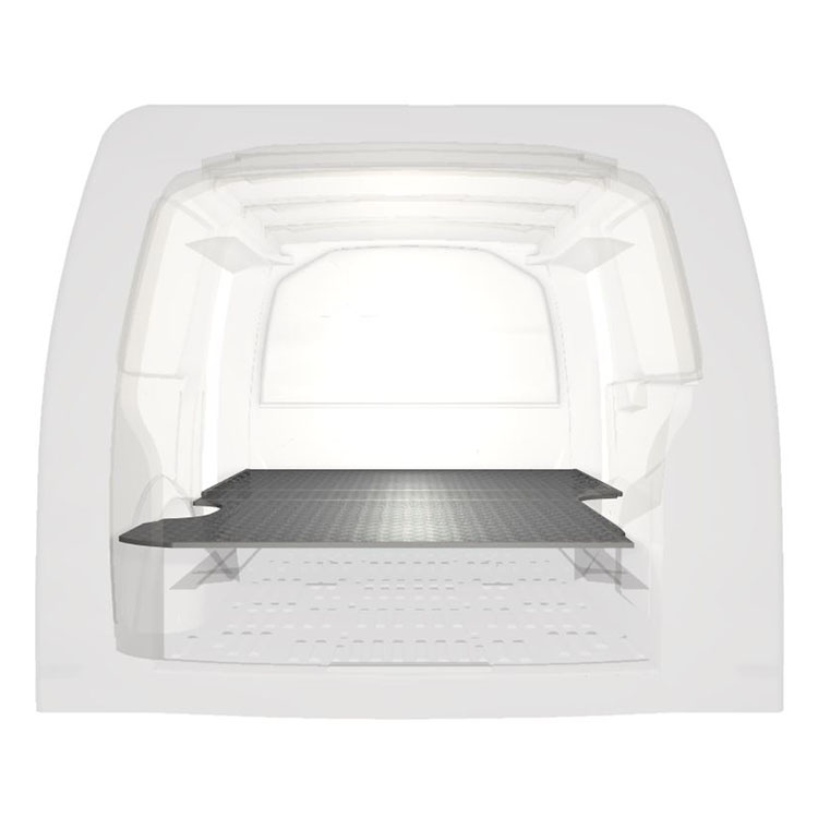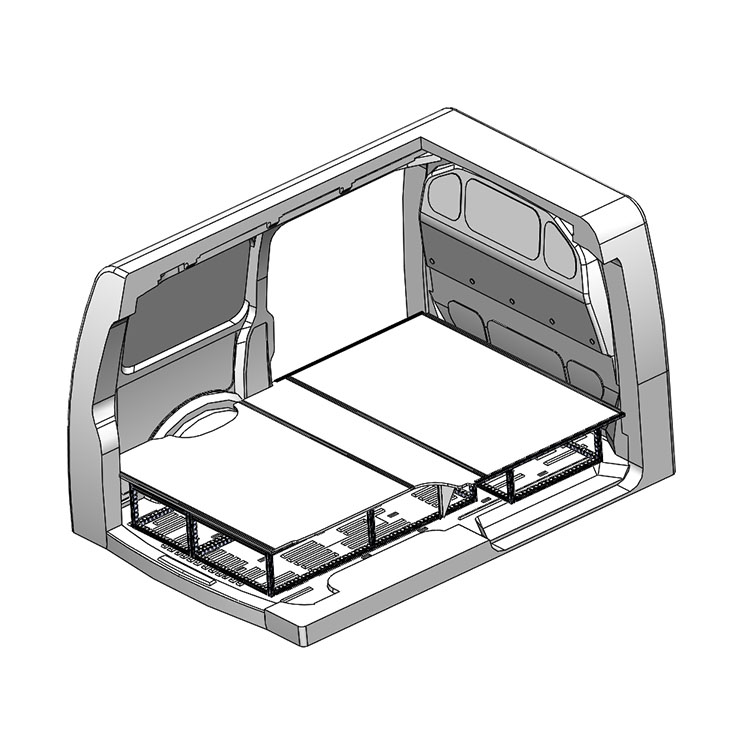 Double floor for a Volkswagen Transporter 2016- L1 with heater. The floor is designed to fit an extra-long drawer solution with one drawer unit 486x1458x270 and one 648x1458x270 coming out from the rear doors, and one drawer unit 648x1458x270 coming out from the side door.