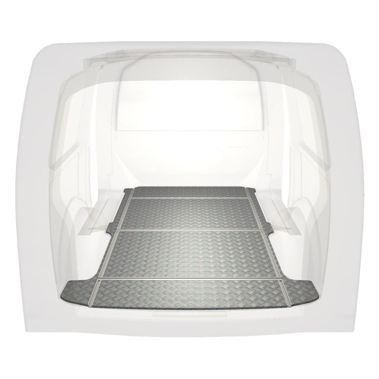 Lett og robust varebilgulv med tverrgående skinner til Volkswagen Transporter T6 med sklisikker tråplate i aluminium og lastskinner (langsgående og tverrgående) for rask og sikker installasjon av hyllesystemer og tilbehør.