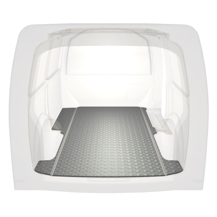 Lett og robust ekstra langt gulv til Volkswagen Transporter T6 med sklisikker tråplate i aluminium og lastskinner (langsgående) for rask og sikker installasjon av hyllesystemer og annet tilbehør.